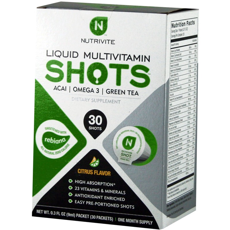 NutriVite, liquid multivitamin shots are unique pre-portioned .3 ounce multivitamin shots which contain 23 vitamins and minerals and also include acai, omega-3 and green tea extract. There is a full 30 day supply in each box. We use rebiana (a natural, no calorie sweetener) to sweeten our citrus flavored shots. Our shots contain no artificial colors of flavors. Shots should be kept at room temperature and require no refrigeration. This product is intended for adult consumption only and should not be consumed by children.