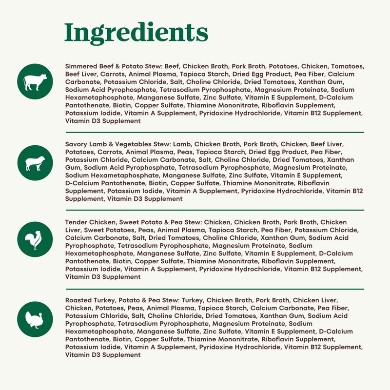 - Variety Pack: Contains thirty-six (36) 3.5 oz.trays of NUTRO Adult Dog Wet Food Cuts in Gravy: nine (9) Beef & Potato Stew, nine (9) Lamb & Vegetables Stew, nine (9) Tender Chicken, Sweet Potato & Pea Stew, nine (9) Roasted Turkey, Potato & Pea Stew
