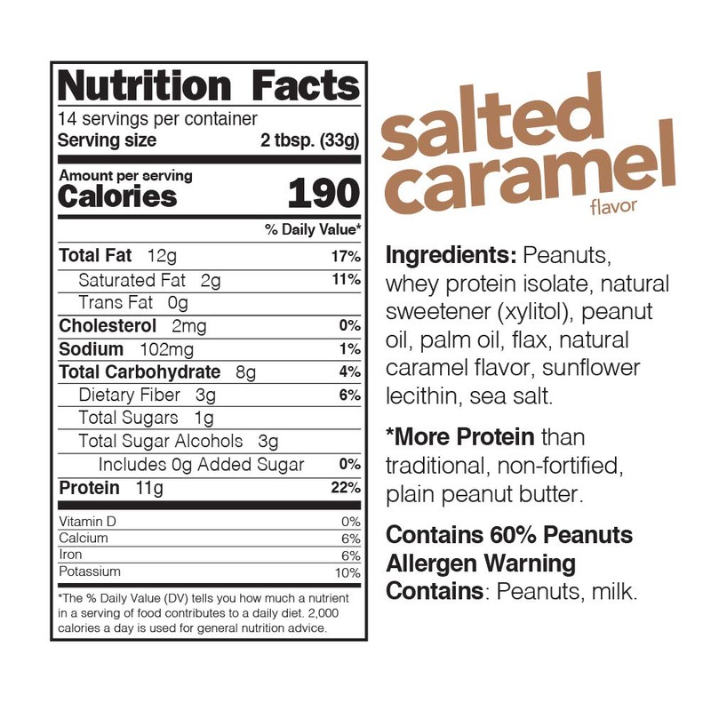 - SALTED CARAMEL PEANUT SPREAD, Sometimes you crave salty, sometimes sweet. This one is the perfect blend of both. Rich caramel tones and a pinch of sea salt make this a cravings crusher. 12 grams of protein. Flax for omega 3's. And 98% lactose-free.