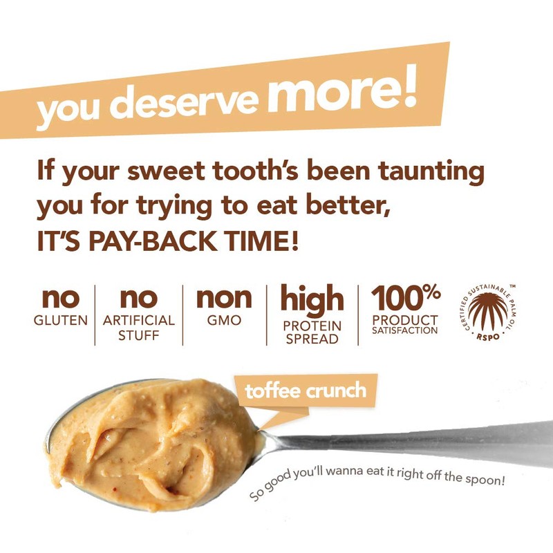 - TOFFEE CRUNCH PEANUT SPREAD, Its crunch time! Indulgently delicious toffee butter crunch bits infuse our signature peanut butter. Destined to become one of your sure favorites. Loaded with12 grams of protein plus flax for omega 3's. 98% lactose free.