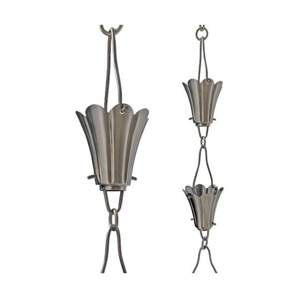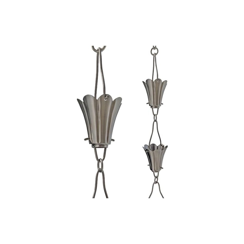 The Japanese word "yuri" means "lily". Small circles connect the beautiful flower shaped cup, combining the beauty of both link and cup style rain chains. Available in stainless steel and copper plated stainless steel for strength and durability.