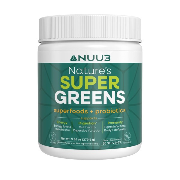 NUU3 Super Greens Superfoods + Probiotics - Immune Support, Improved Energy & Gut Health Digestive Enzymes - Boosts Immunity - 30 Servings (Unflavored)