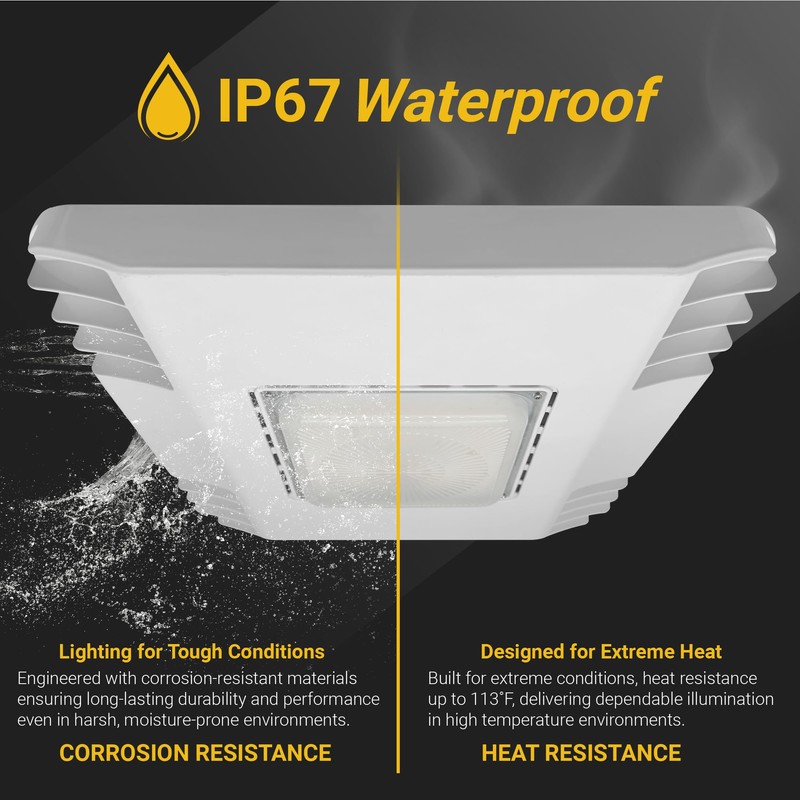 - IP67 Waterproof — These IP67 rated LED canopy lights are waterproof, rust resistant, and anti-corrosive, ensuring protection against rain, snow, dust, and extreme heat.