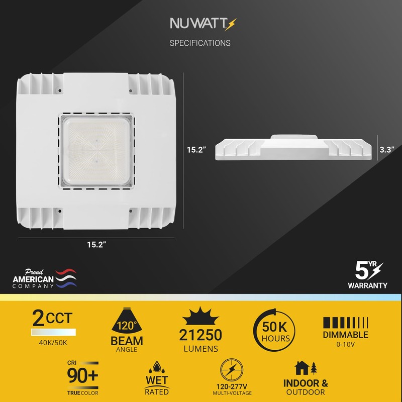 - Best in Class Certifications — NuWatt’s canopy lights deliver exceptional quality and energy efficiency, fully backed by ETL, DLC, and UL certifications.