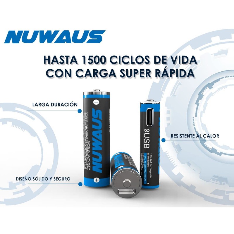 - Paquete con 4 Baterías AA recargables de 1,5 V con Carga Rápida vía cables tipo C. Las pilas cuentan con una capacidad de energía de 2200 mWh y una capacidad de carga de 1460 mAh.