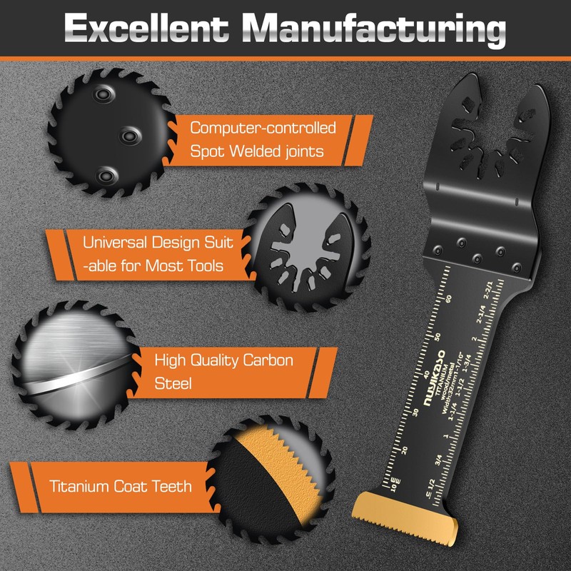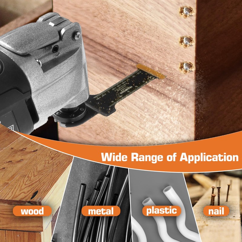 - Designed by professional designers, multitool blades are made of high-carbon steel and come with a titanium coating. It is more abrasion, rust, and heat resistant than standard bimetal saw blades. Its excellent impact resistance gives the oscillating saw blade greater efficiency and a 2 x longer life.