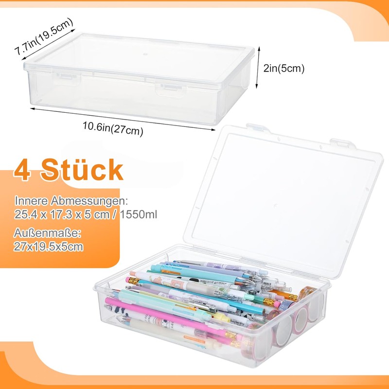 - Storage box: set of 4 simple flat C5 storage boxes and inner dimensions 25.4 x 17.3 x 5 cm, the larger to perfectly store C5 envelopes. The plastic boxes are designed in a minimalist style and perfectly match the shelves in your craft room, living room, bathroom cabinet and office.