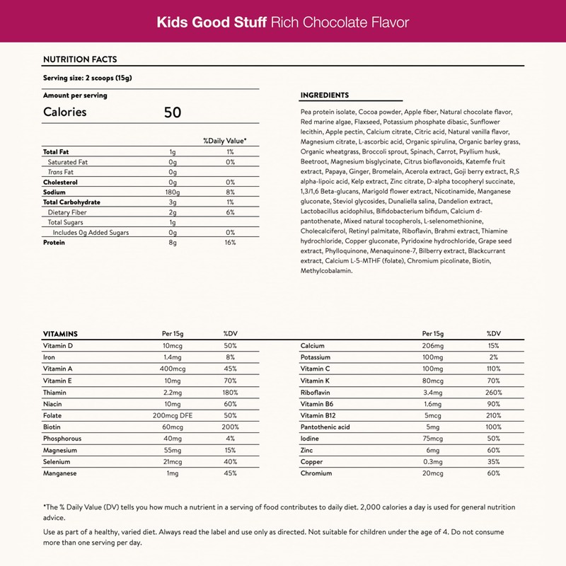- HEALTHY BONES - Kids Good Stuff has a variety of different fruits and vegetables, 200mg calcium and 8mg of plant-based protein to aid growth and development. Both kids and adults can enjoy this smoothie every day!