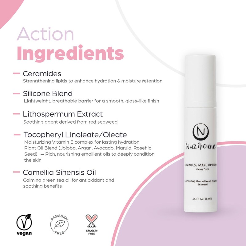 Nuzilicious Professional Grade Flawless Makeup Primer – Achieve Dewy Skin & Effortlessly Blend Makeup with Luxurious Plant Oil Blend, Ceramide & Seaweed Extracts, Vegan & Cruelty-Free, 0.25 oz