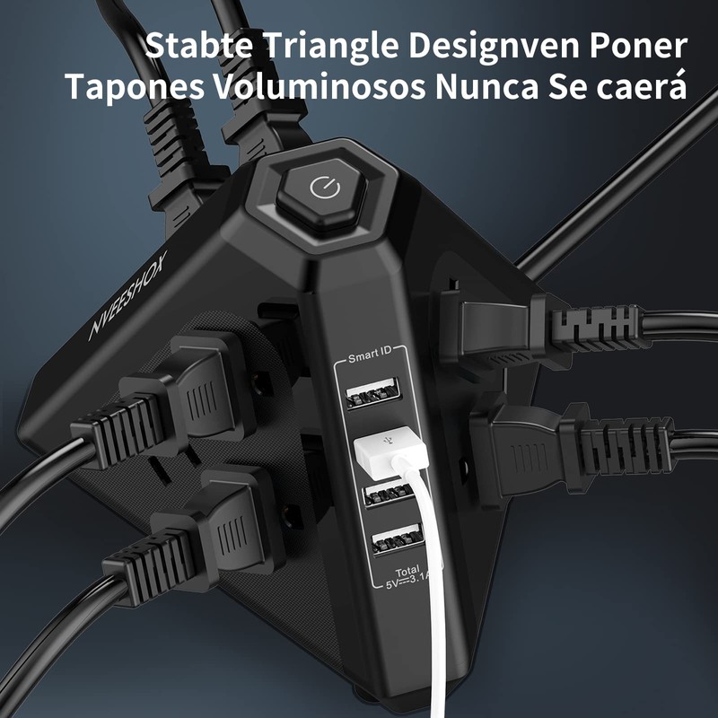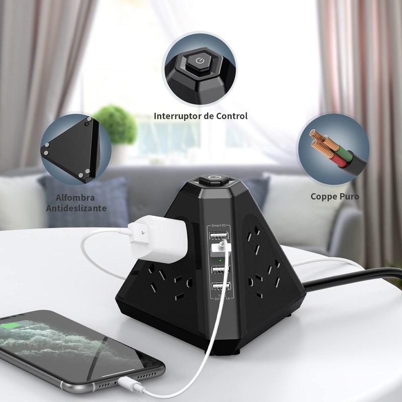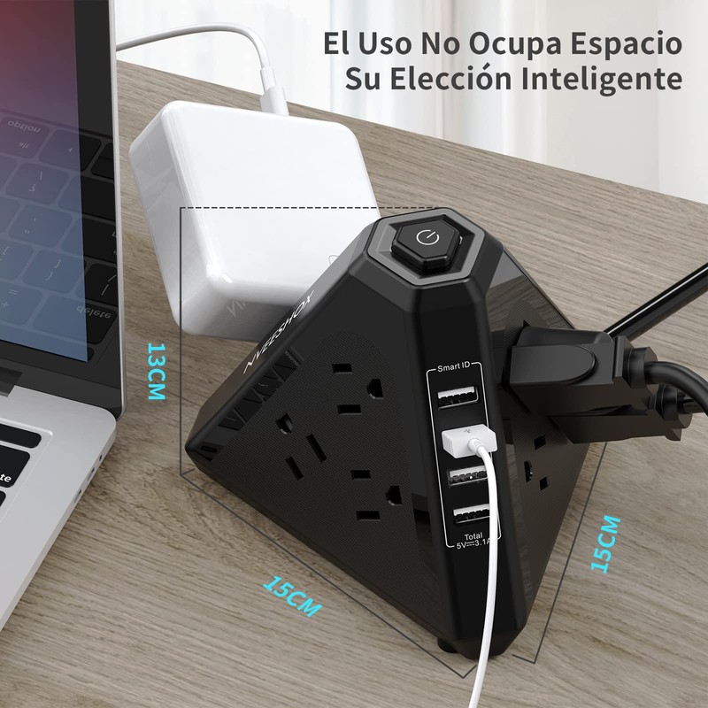- EL DISEÑO VERTICAL AHORRA ESPACIO : El exclusivo diseño vertical triangular del multicontacto inteligente, el regleta multicontacto se puede instalar en un espacio limitado, sin apenas ocupar espacio; y la base estable proporciona una sólida capacidad de carga, además hay 5 pies de goma en la parte inferior para evitar resbalones