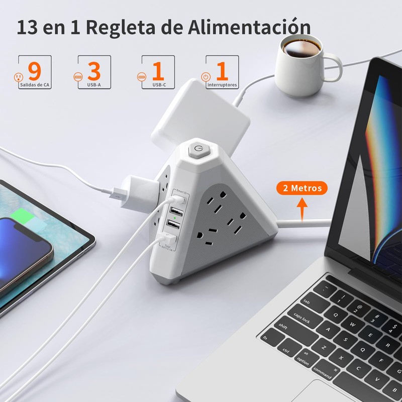 - 【Diseño vertical triangular único】multicontacto torre Triángulo se puede instalar en un espacio limitado, y el diseño de 45° del enchufe hace que otros cables no lo obstruyan. Ideal para montar detrás de sofás, armarios, estanterías y otros muebles, la base resistente tiene 5 pies de goma para evitar resbalones. El tamaño compacto y portátil del enchufe multiple cabe perfectamente en el equipaje, lo que le permite cargar todos sus dispositivos mientras viaja