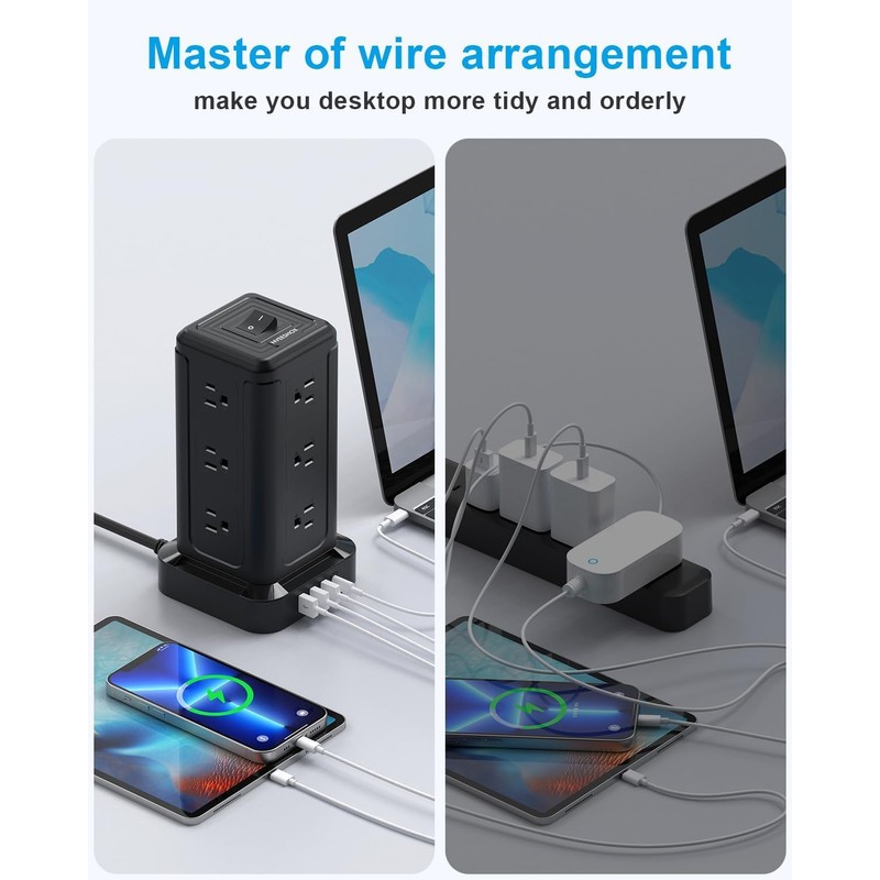 - Ahorro de espacio multicontacto de torre: este regleta multicontacto torre usb con 12 salidas de CA y 4 puertos USB (1 USB C- PD 20W), puede alimentar hasta 16 dispositivos electrónicos simultáneamente. Esta torre multicontacto puede hacer que tu escritorio de oficina esté más ordenado sin esos cables desordenados.