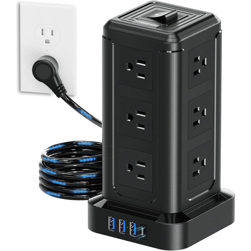 NVEESHOX Regleta Multicontacto, Torre Multicontacto USB con 12 Tomas de CA y 4 USB(1 USB C- PD 20W), Extension Electrica de 3 m, Enchufe Multiple con Protector de Sobretensión para Hogar y Oficina
