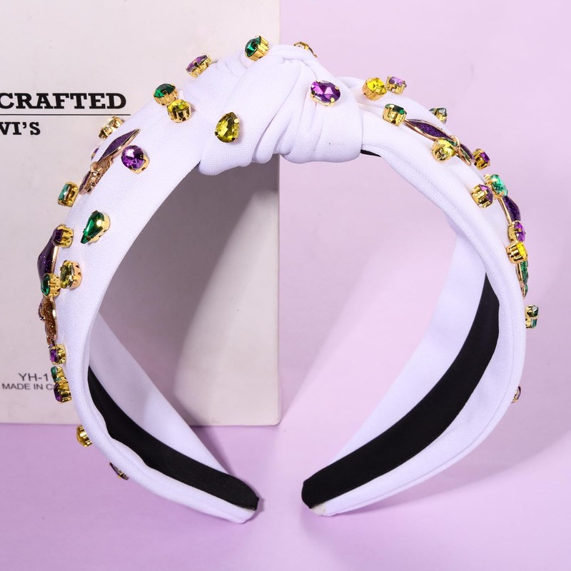 - ღ Mardi Gras Headband -- Be the queen of Mardi Gras with these festive purple headbands! Features wide top knot headband with accent tricolor baroque gemstones pearls and enamel charm embellishments like crown, mask, letter Mardi Gras, and fleur de lis, perfect for jazzing up your Mardi Gras outfits with all that glitz and glam it brings! These jeweled knotted headbands are the perfect Fat Tuesday hair accessories and are absolutely gorgeous for your Mardi Gras festivities y’all! Parade ready!