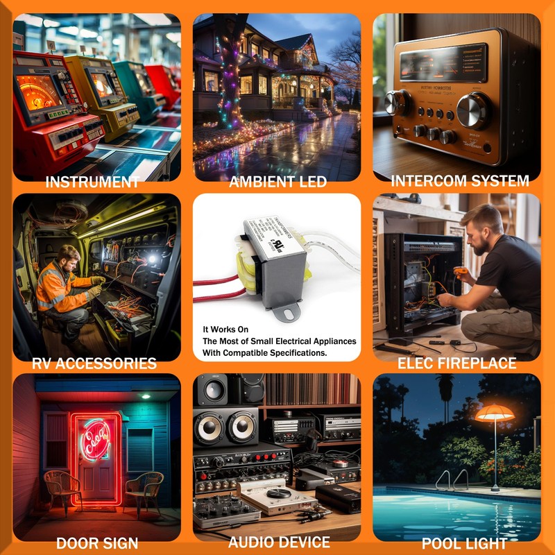 - Flexible Power Supply Solution: With a Rated Capacity of 10VA, This 12v Transformer Provides Enough Power to Drive Different Types Of Low voltage Equipment, Making It Suitable for Use as a 12V Power Supply in Various Applications Such as Audio Devices, Lighting Power Supplies, Furnace, Fan, Instruments and Meters, Synchronous Motor, RV Accessories Replacement, Intercom System, Garden Irrigation, Doorbell Transformers, Landscape Lighting Transformer and Other 12V AC Voltage Adaptive Products