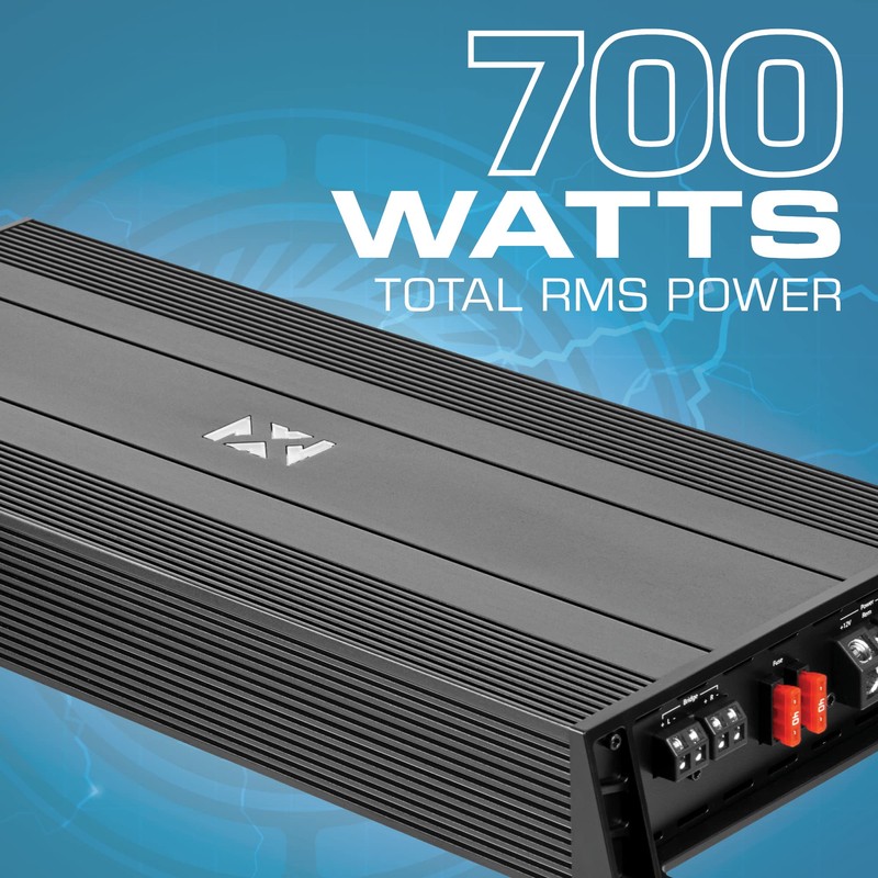 - RMS Power Rating: 4 ohms: 200 watts x 2 channel | 2 ohms: 350 watts x 2 channel | Bridged, 4 ohms: 700 watts x 1 channel