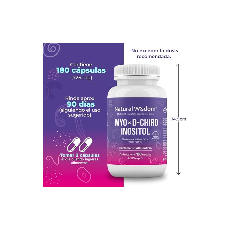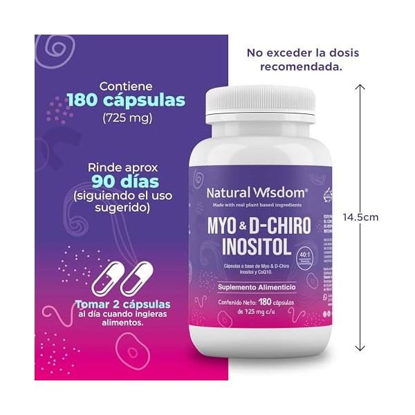 Natural Wisdom crea un nuevo suplemento inositol myo inositol y d-chiro-inositol formulado a base de una mezcla concentrada de Myo & D-Chiro-Inositol en combinación 40:1 que ayudar en la función del sistema endocrino. Además, esta complementado con Coenzima Q10. Suplemento formulado con ingredientes naturales actúan en sinergia para apoyar en mantener una buena salud. Modo de uso: Tomar 2 cápsulas al día de preferencia al consumir alimentos. No exceder la porción diaria recomendada. Ingredientes: Mezcla 40:1 Myo & D-Chiro Inositol Coenzima Q10 Características Organolépticas: Apariencia: Cápsulas duras Color: Blanco Condiciones de almacenamiento: Mantener el empaque bien cerrado. Conserve en un lugar fresco y seco entre 10° y 20°C. No se exponga a la luz solar directa.