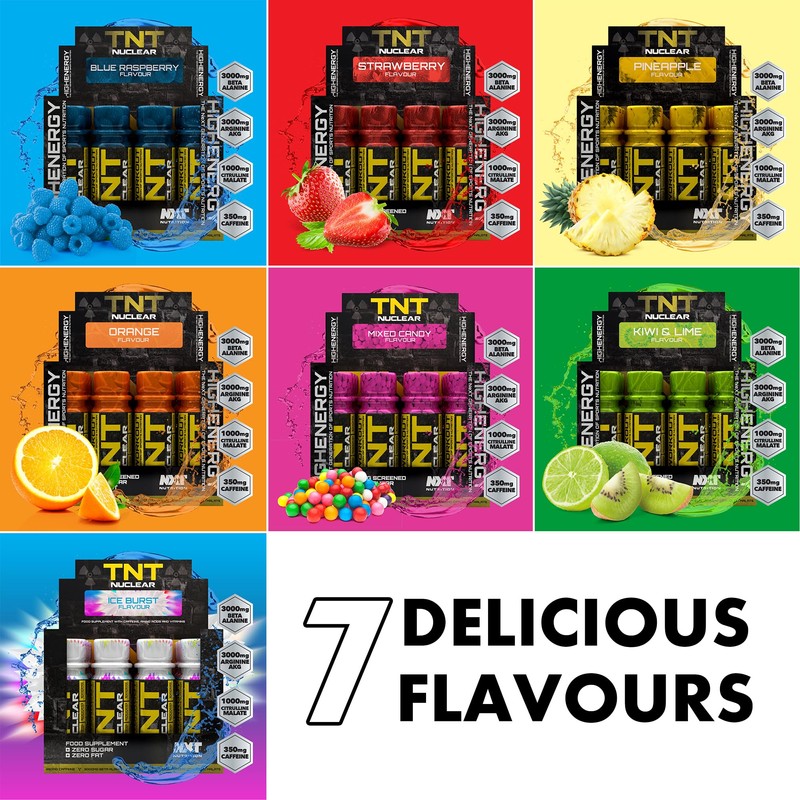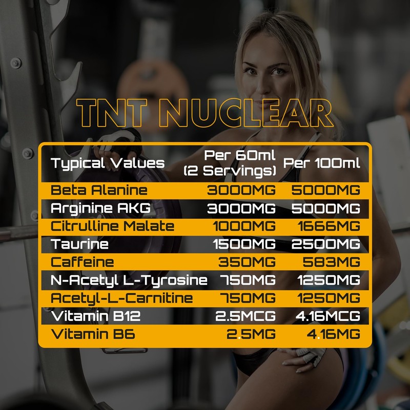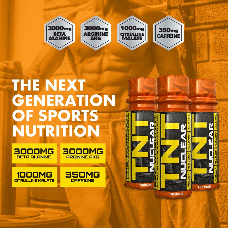 Product descriptionNXT Nutrition TNT Nuclear Shots Pre Workout Drink 12 x 60ml OrangeIngredientsWater, Arginine AKG, Beta Alanine, Taurine, Citrulline Malate, N-Acetly-l-Tyrosine, Acetyl-l-Carnitine, Caffeine, Acidulants (Citric Acid, Phosphoric Acid), Flavouring (Orange Flavour), Colouring (Sunset Yellow E110), Preservatives (Potassium Sorbate, Sodium Benzoate), Sweetener (Sucralose), Vitamins (Vitamin B6 {Pyridoxine Hydrochloride}, Vitamin B12 {Cyanocobalmin}
