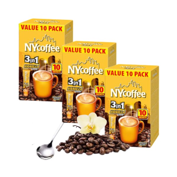 NY 3-in-1 Instant Coffee Vanilla Flavoured Sachets of 30 Packets x 14g Bundle with TinTastic Latte Spoon