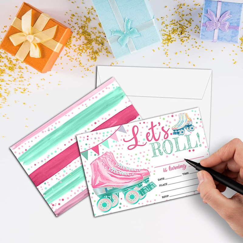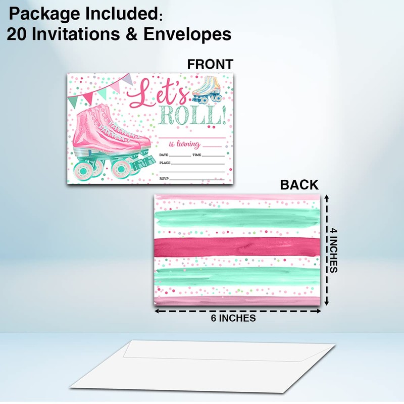 NYCTUG Let's Roll Birthday Fill-In Invitation(4" X 6"), Roller Skate Birthday Party Double-Sided Invites- 20 Invitations With Envelopes-Party Supplies-A17