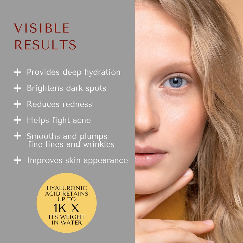 - DEEP HYDRATION BOOST – This hyaluronic acid serum for the face delivers intense moisture, helping to smooth and plump skin by retaining up to 1000 times its weight in water, reducing the appearance of fine lines and wrinkles.