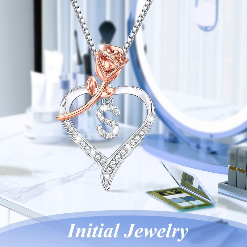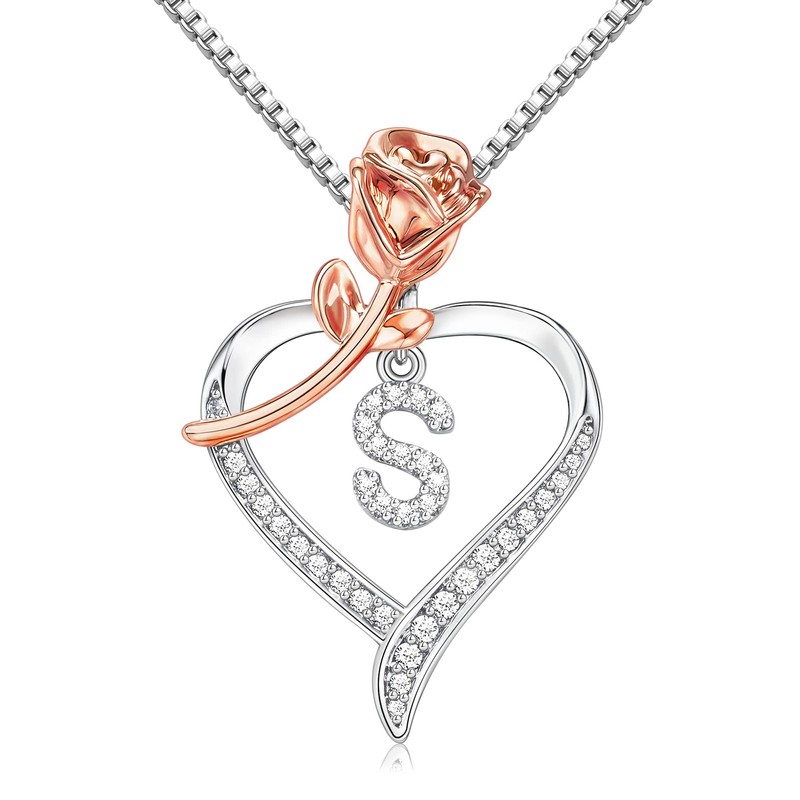 Nymerianoble Heart Necklace Silver Rose Heart Necklaces for Women CZ Pendant Letter S Initial Necklaces for Women Birthday Gifts for Mom