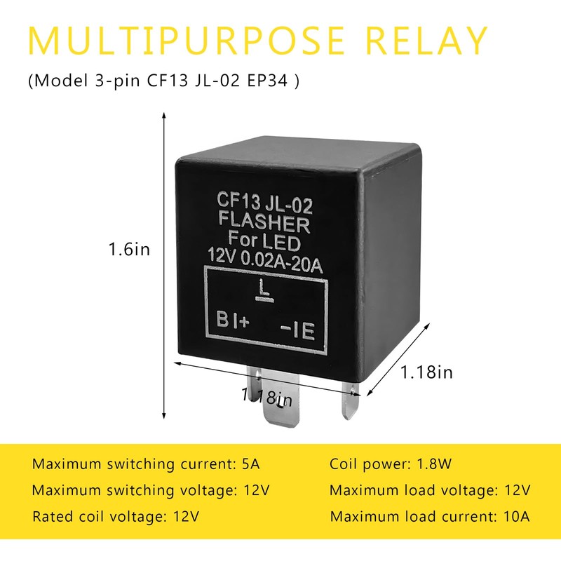 - Versatile Application: The 3-pin CF13 JL-02 EP34 electronic flasher relay is compatible with 12V electrical systems, making it suitable for most cars, trucks, and marine applications. It is the ideal choice for headlights, horns, and auxiliary lighting devices, providing reliable performance