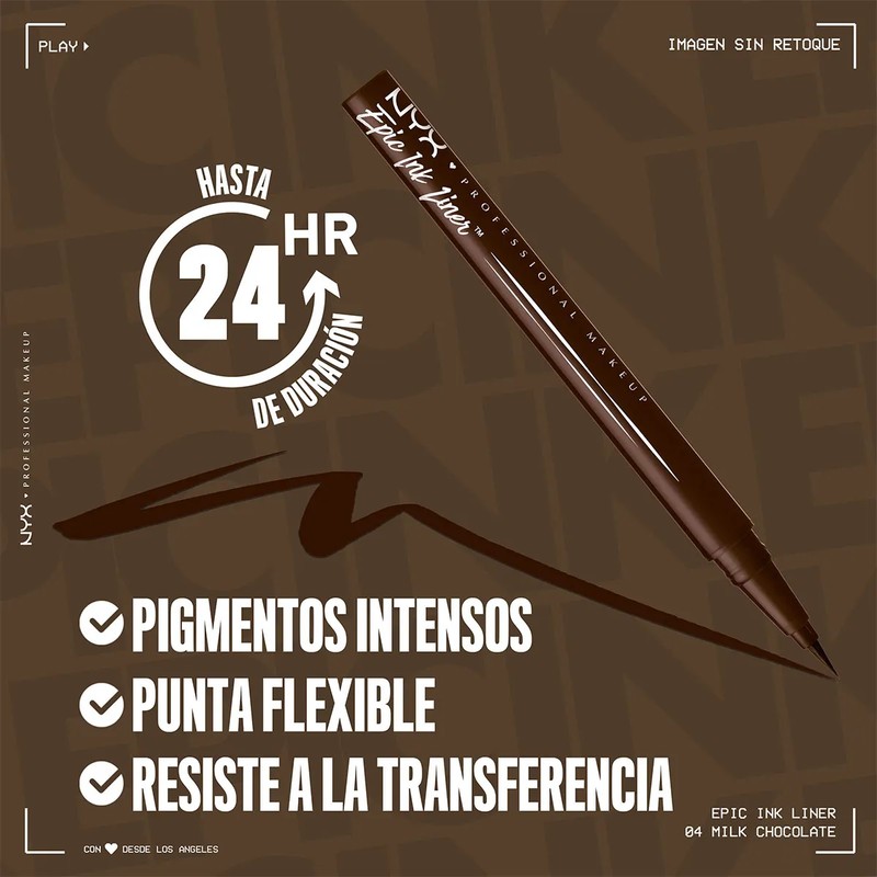 Consigue delineados perfectos con el Nyx Professional Epic Ink Liner en el tono Milk Chocolate ✨. Su punta de pincel de alta precisión y fórmula a prueba de agua es ideal para looks duraderos. 💖