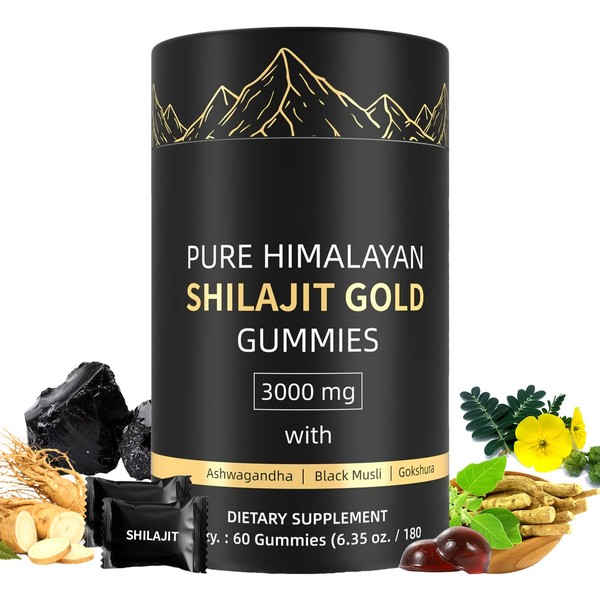 • NATURE'S SOURCE OF ENERGYOur Shilajit Gold Gummies are rich in essential nutrients for the human body, Including Fulvic acid, Humic compounds, and 85+ types of trace minerals. 100% pure natural and organic, free of any pollution or other impurities. Each gummy contains 3000 milligrams of Shilajit. Take two every day to provide you with comprehensive support and nutrition