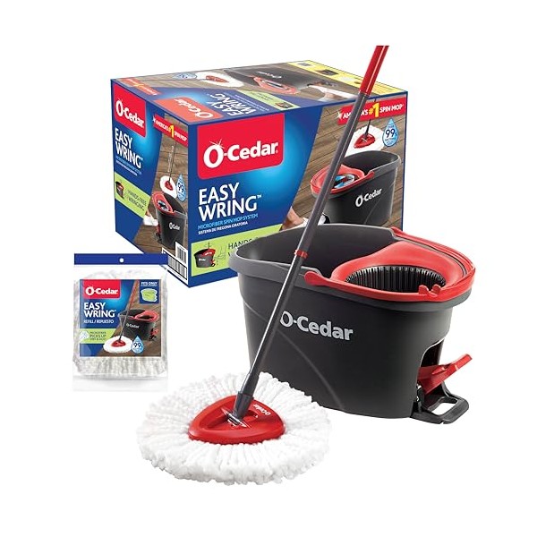 • DEEP CLEANING MICROFIBER: O-Cedar's EasyWring Microfiber Spin Mop & Bucket Floor Cleaning System uses millions of strands of advanced microfiber to effectively capture dirt and grime with just plain water, eliminating the need for harsh chemicals. Safe for all hard flooring, including finished hardwood, wood, laminate, tile, vinyl and more.
