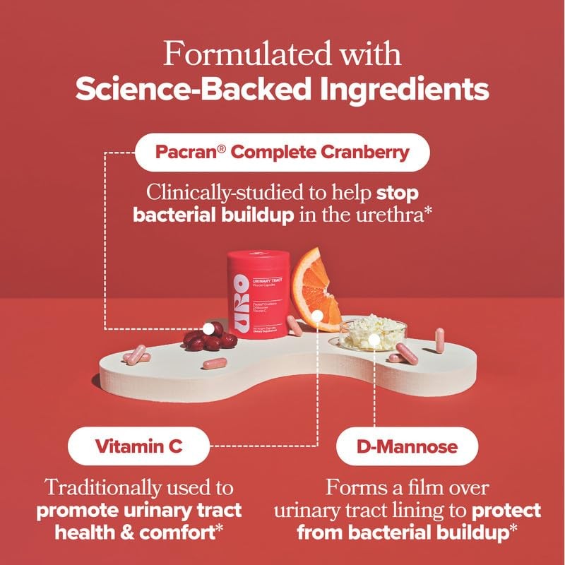 - Antibiotic-Free Formula for a Healthy Urinary Tract: URO uses clinically-studied ingredients like Pacran Complete Cranberry for urinary tract health. It also contains Vitamin C and D-Mannose, which forms a film over urinary tract lining cells to protect from bacterial buildup*.