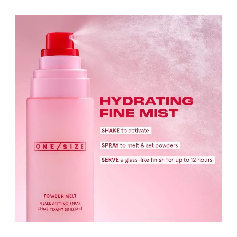 - A skin care-infused, hydrating setting spray that seamlessly melts powder layers for a radiant, glass-like finish that lasts all day.