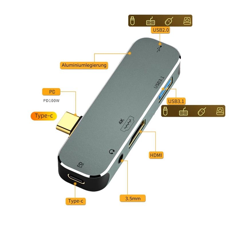 TOP! 5-in-1 adapter USB 3.1 Type C to USB 2.0 + USB 3.1 + USB-C with PD + HDMI + 3.5 mm suitable for PC, laptop, tablet and smartphone.