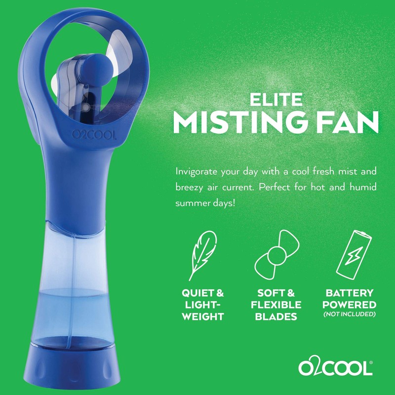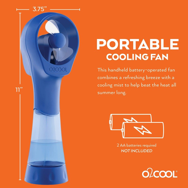 Stay comfortable even in the scorching heat. A cool mist of water is combined with a powerful fan to improve your personal cooling process. The Misting Fan from O2COOL is the most convenient way to cool down. Give yourself a fine mist of water to your face as the fan blows fresh air blows your way. It’s like your own personal cooling system. MORE ABOUT THIS PRODUCT: Powerful One-Speed Motor with Flexible Fan Blades Fine-Mist Sprayer Thumb Activated Pump Trigger with Comfort Grip Large Reservoir Bottle Holds Over 1, 000 Mists Large Opening to Fill with Water and Ice Perfect for Camping and Outdoor Activities Requires 2 AA-Cell Batteries (Not Included) PRODUCT SPECIFICATIONS Blade Size: 2. 75 Inches Number of Speeds: 1 Number and Type of Alkaline Batteries: 2 AA-Cell Batteries Product Dimensions (Retail Packaging): 3. 1” x 3. 8” x 10. 6”YOUR OWN PERSONAL COOLING SYSTEM Don't sweat it this summer with the assistance of your own personal handheld fan and mister. Tackle the summer heat with a mist of cooling water and a powerful fan. You can add ice cubes to your water reservoir bottle to get an even cooler and refreshing feel. COLORFUL & STYLISH DESIGN All of our fans are compact and cute. It’s not bulky and it looks great at the beach, pool, campsite, hiking trail, baseball game, and barbecue or even in the office. It’s a great way to cool down during hikes, long walks, marathons or bike rides. O2COOL is all about giving our customers unexpected solutions to everyday problems. Our products are smart, and they meet day-to- day human needs. But they’re more than that! They’re ordinary objects with an extra twist. They’re clever and witty. They make everyday occasions and tasks just a little better. Not only better, but fun!
