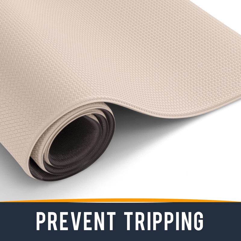 - No Tripping,Non-Slip:The non skid kitchen mat is designed with advanced sealed edge and non-slip backing,it will provent you from tripping and slippage. Padded kitchen mats are cushioned enough to bring comfortable support but not too thick to be a tripping hazard.