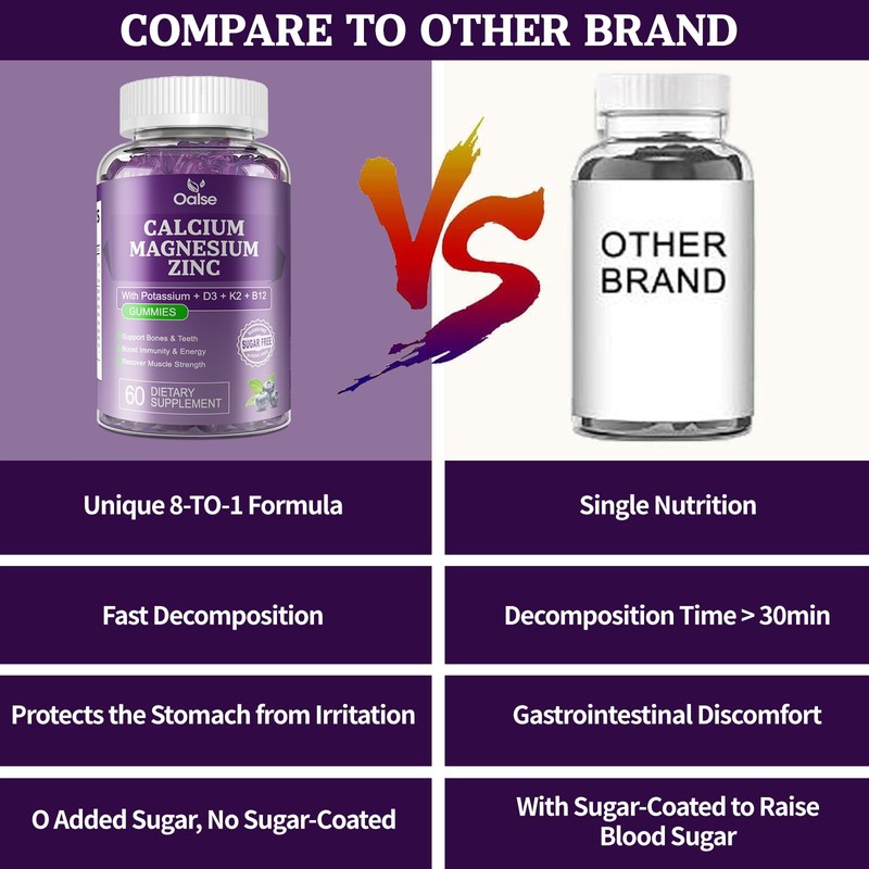 - Promote Health: Calcium, magnesium, and zinc are essential nutrients for our daily needs. Children need plenty of calcium, magnesium, and zinc for growth, while adults may experience bone degeneration as they age. Our vegan sugar-free calcium gummies deliver 1200mg of calcium, 400mg of magnesium, 11mg of zinc, as well as vitamins D3, B12, and K2, supporting healthy bone development and immune function