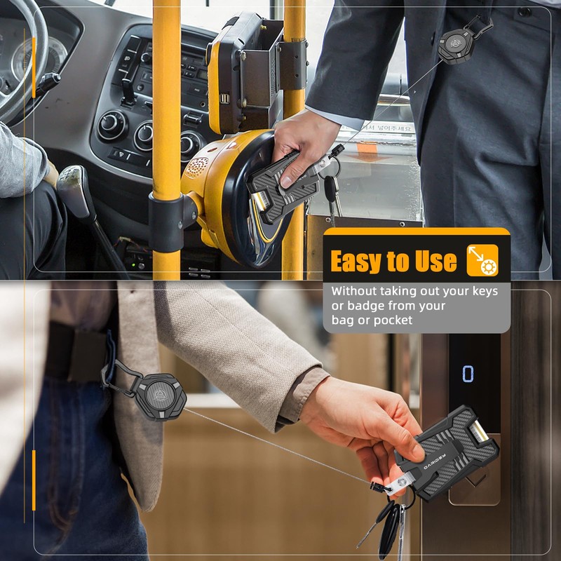 - 31.8" RETRACTABLE LENGTH The Oaridey system's ID yo-yo steel rope extends to 31.8" - an ergonomically optimized length perfectly matched to the retraction requirements of retractable key fob. No more tedious searching for ID or keys in bags or backpacks.