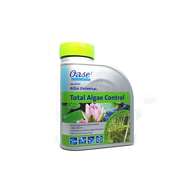 Remove as much algae as possible prior to use in order to avoid unnecessary oxygen deprivation. Ensure an adequate supply of oxygen. Shake bottle vigorously before use. Using the measuring cup, add 50ml to 1,000 litres of pond water and distribute evenly. Additional dosage of half of the quantity is recommended after approx. 4 weeks in cases of strong algae growth. The treatment takes effect within approx. 2 to 3 weeks (assuming metabolic activity of the algae). Remove dead algae manually. Switch off UVC equipment for 10 days during application. Pond plants may develop brown spots in rare cases, which disappear again quickly.