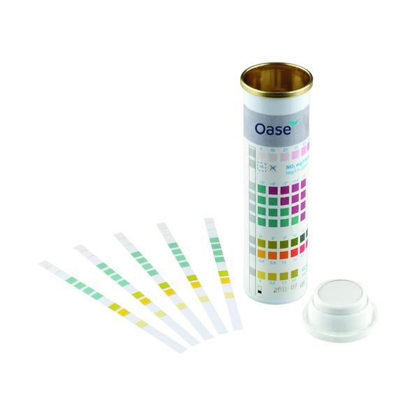Water quality is a crucial factor for the biological balance within a pond and the health of fish and other pond inhabitants. Consequently, from time to time it is recommended to check the water parameters and take corrective action if necessary. With Oase AquaActiv Quickstick 6 in 1 you can quickly and easily check six of the most important water values in just over a minute. Simply dip a test strip for 1 second into the pond water, briefly shake off the strip and wait for approximately 1 minute, then compare the colour fields on the strip with the colour scales.