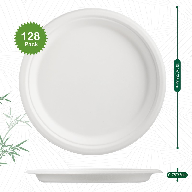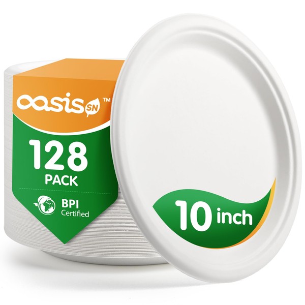 OasisSN [10 Inch, 128-Pack Compostable Paper Plates, Heavy-Duty Biodegradable Disposable Dish Made from Bagasse, Perfeck for Snacks, Desserts, Party, Wedding and More (BPI Certified)