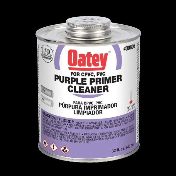 The Oatey 30806 is an all-purpose pipe primer and cleaner. It comes in a thirty-two ounce can and is used for PVC and CPVC pipes and fittings. This purple-tinted formula meets various environmental requirements and is less aggressive compared to clear primers.