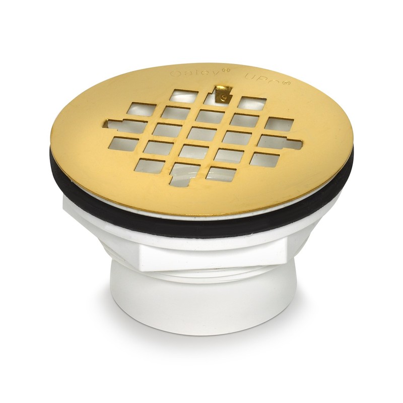 OATEY shower drain, PVC, OATEY, series: 101 PS, 2 in connection, solvent weld connection, suitable for use with: 2 in sch 40 dwv pipe, 4-1/4 in strainer, Ultra shine PVD polished brass strainer, white, upc, CSA certified, ISO 9001 certified, used preformed shower stall bases. Designed for use with preformed shower bases: fiberglass, acrylic, nylon or metal. Mechanically attaches over 2-inch sch 40 dwv pipe. Polished brass strainers have PVC lifetime finish.
