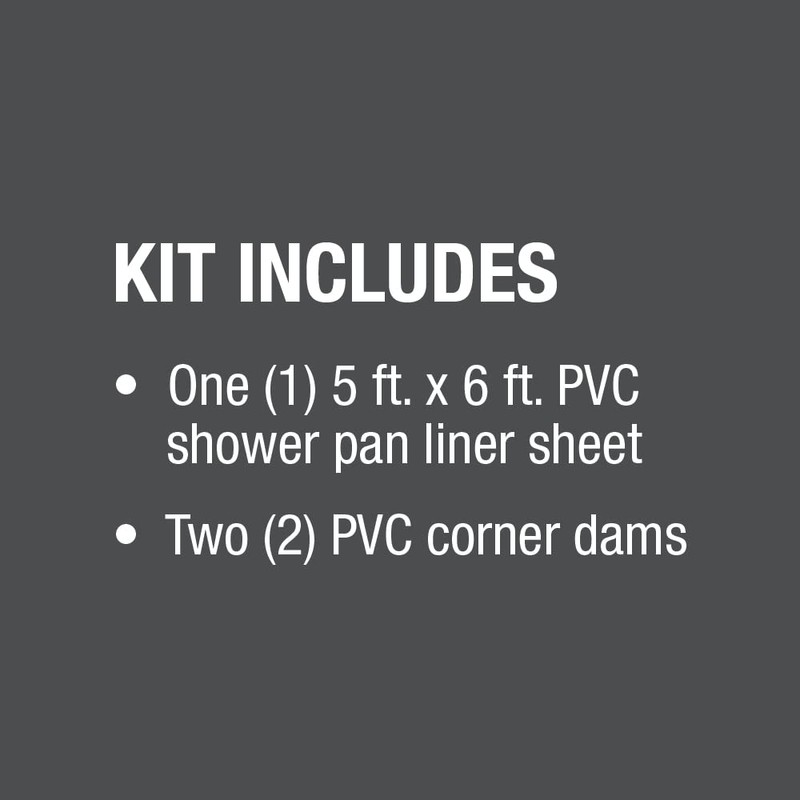 - Kit includes (1) 5 ft. x 6 ft. PVC Shower Pan Liner Sheet and (2) PVC Corner Dams