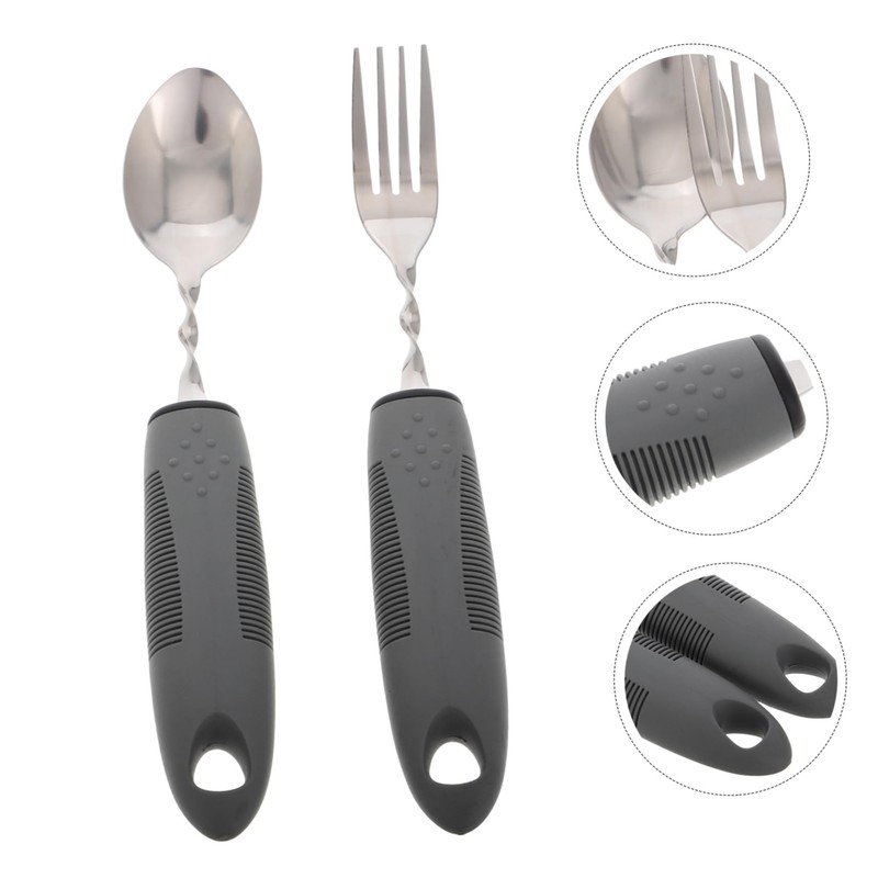 adaptive spoons This set of adaptive utensils is designed to promote independence and confidence during mealtime for the elderly and disabled.adaptive utensils The bendable design allows for decoration, ensuring that each user can find the most comfortable position for eating.adaptive gripper The stainless steel fork and spoon feature rubber handles that are comfortable to hold and help reduce