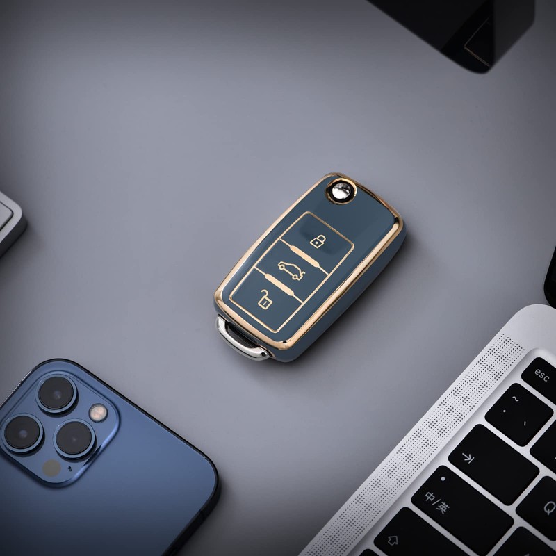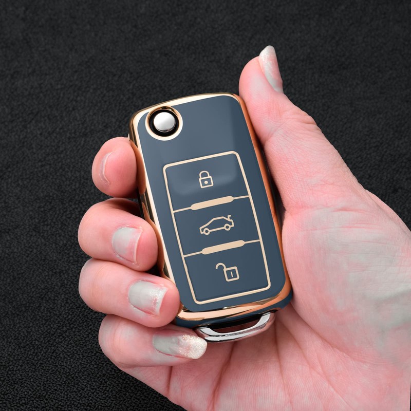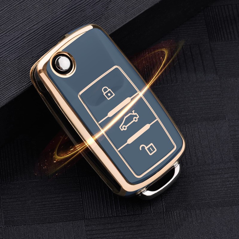 OATSBASF Car Key Case VW, VW Golf Key Box, Key Cover for VW Polo Passat Skoda Seat 3 Buttons (Golden Edge Grey)