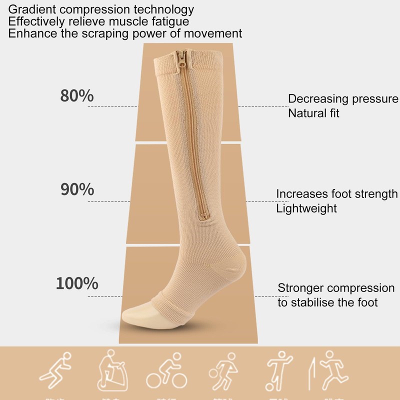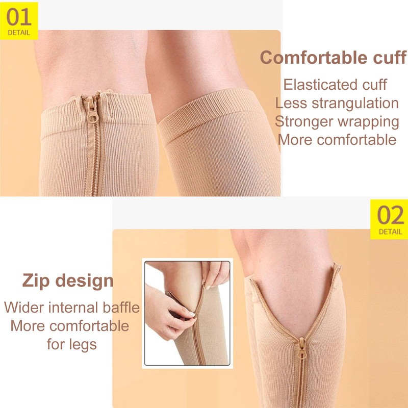 - 3.Effortless On & Off with Zipper Design: Enjoy hassle-free application and removal with zippered compression socks(graduated open toe support stockings ). Equipped with a high-quality zipper, you can effortlessly put on the socks independently. The inner fabric safeguards your skin from zipper irritation, ensuring a smooth, comfortable fit.