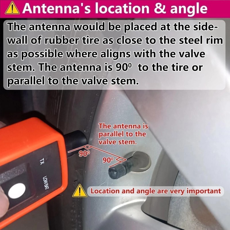 2. Starting relearn process from left front tire, point antenna on correct position. Press & hold power button. Once the speaker chirped, move to the next tire.