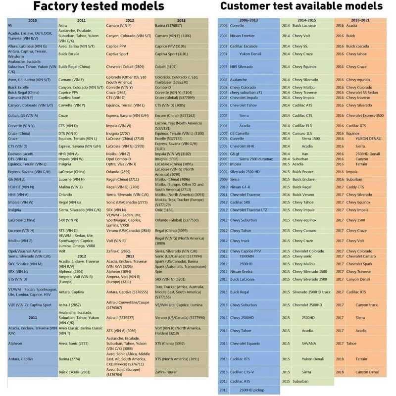 2011: Acadia, Enclave, Traverse (VIN R/V), Alpheon, Antara. Captiva, Astra, Avalanche. Escalade, Suburban, Tahoe, Yukon (VIN C/K), Aveo, Barina (VIN S/T), etc.,