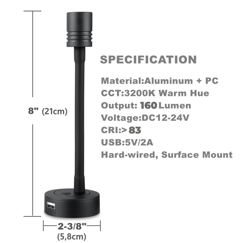 Obeaming Obeaming 12V Dimmable Reading Light Campervan Boat Bedside Reading Lamp, Gooseneck LED Spotlight for Camper Van Caravan Truck Motorhome Caravan, Equipped USB Charger & Press Dimmer Switch