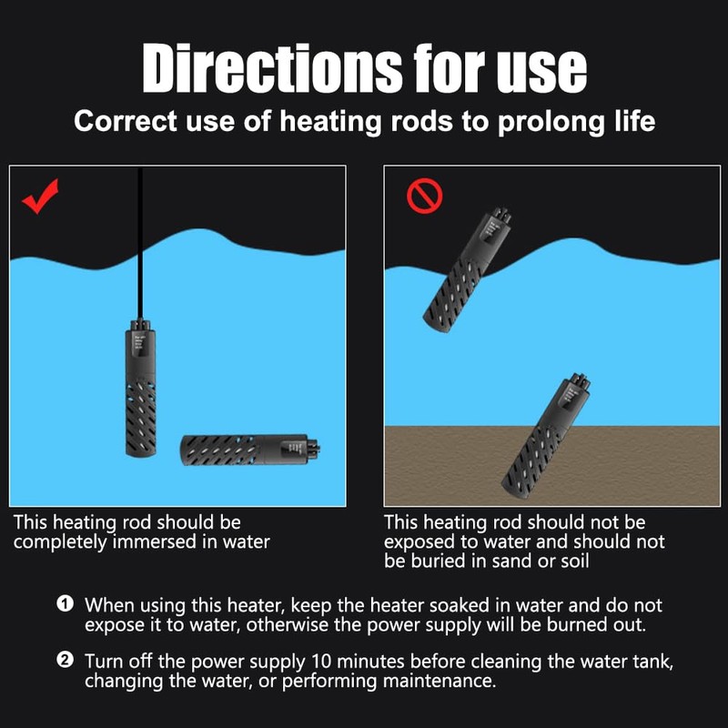 • How to use: 1. When using the heating rod, the water must be immersed in the heating rod. Make sure that it is not on the water surface or buried in sand and stones at the bottom of the water to avoid burning out the power supply.